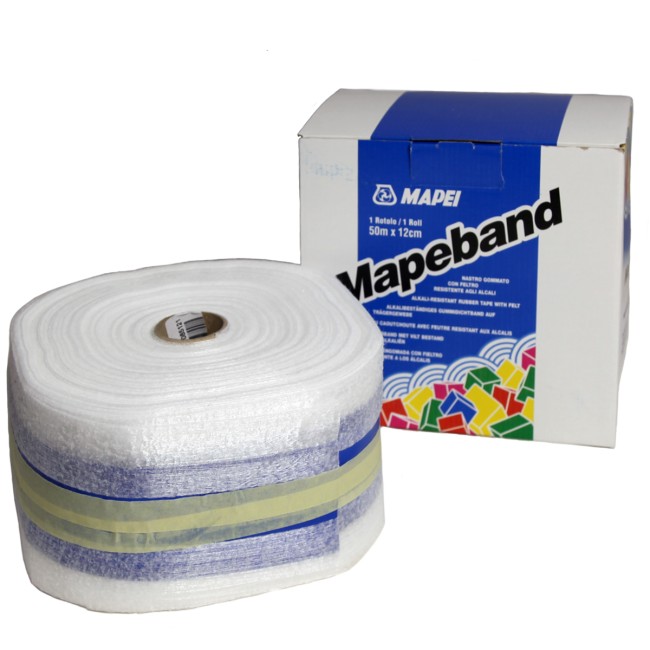 Специальная водонепроницаемая лента Mapei Mapeband – представляет собой водонепроницаемую прорезиненную ткань шириной 12 см с повышенной щелочестойкостью для применения в качестве армирующего слоя совместно с обмазочными гидроизоляционными составами на цементных и полимерных основах (Mapei Mapelastic, Planiseal, Mapei Mapegum WPSи т.д.). Лента, кроме полной водоизоляции, обеспечивает также и полную пароизоляцию зоны применения. Используется для усиления зон примыканий полов и стен, а также примыканий стен на деформационных швах. Лента Mapeband обладает высокой эластичностью и деформативностью, и сохраняет эти свойства в различных условиях эксплуатации, в том числе при отрицательных температурах. Синим цветом выделена прорезиненная зона, белые края - щелочестойкая ткань.