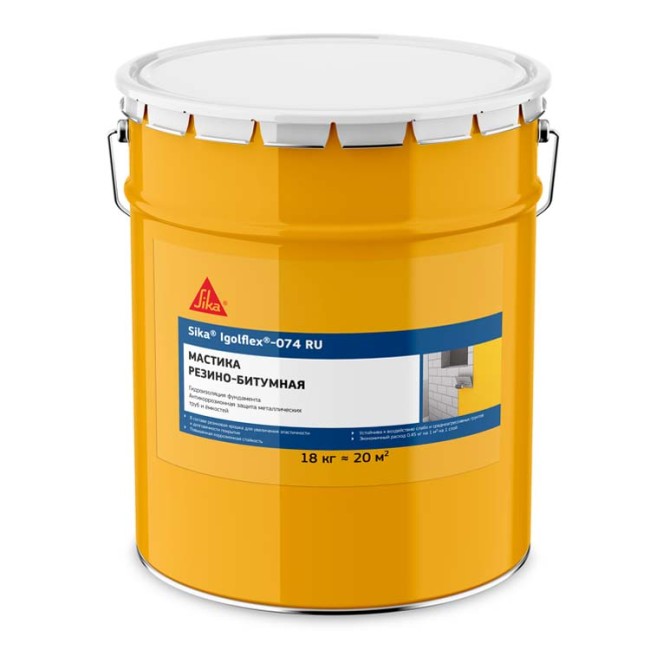 Sika Igolflex-074 - однокомпонентная резино-битумная мастика. Применяется для гидроизоляции подземных конструкций - прекрасно зарекомендовала себя на бетонных, цементных и деревянных конструкциях. Может применяться для антикоррозийной обработки металлических труб и резервуаров. Содержит растворитель.