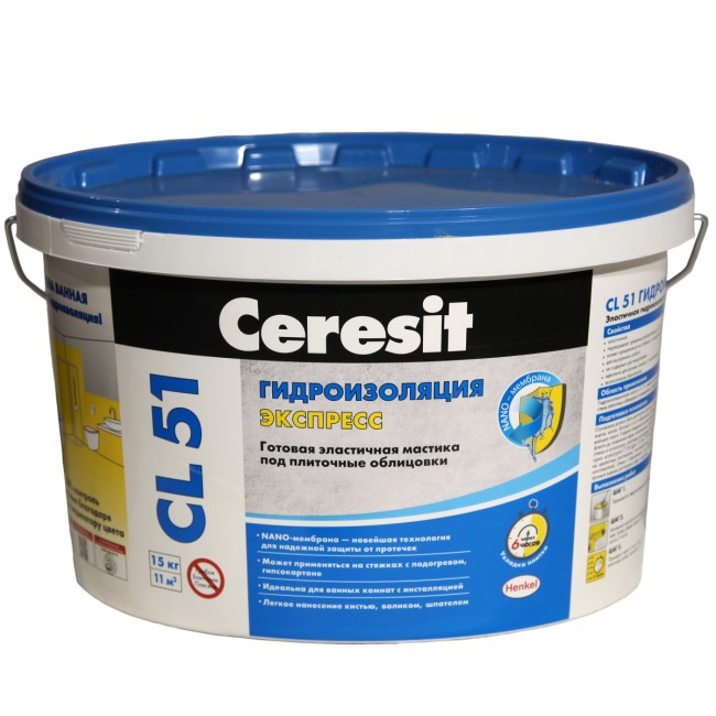 Эластичная полимерная гидроизоляция Ceresit CL 51 – представляет собой пастообразную массу, которая наносится на поверхности полов и стен перед укладкой плитки с целью защиты несущих и ограждающих конструкций от проникновения влаги. Используется только при выполнении внутренних работ на основаниях, подвергающимся периодическому увлажнению (ванные комнаты, душевые, кухни, санузлы и туалеты). Обеспечивает полную водо и паронепроницаемость как поверхностей, на которые будет укладываться плитка, так и зон вводов труб и сантехники. Может наноситься как на цементные и бетонные поверхности, так и на гипсовые основания, поверх гипсокартона, пеноблоков, кирпичной кладки.