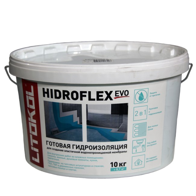 Эластичная полимерная гидроизоляция Litokol Hidroflex – представляет собой полимерную массу, которая наносится на оштукатуренные основания - полы и стены - перед укладкой плитки с целью защиты несущих и ограждающих конструкций от проникновения влаги и воды. Образует водо- и паронепроницаемую мембрану, поэтому используется только при выполнении внутренних работ. Предназначена для обработки оснований стен и полов в зонах, подвергающихся периодическому увлажнению (ванные комнаты, душевые, кухни, санузлы и туалеты). Может наноситься как на цементные и бетонные поверхности, так и на гипсовые основания, поверх гипсокартона, пеноблоков, кирпичной кладки. Состав не содержит растворителей.
