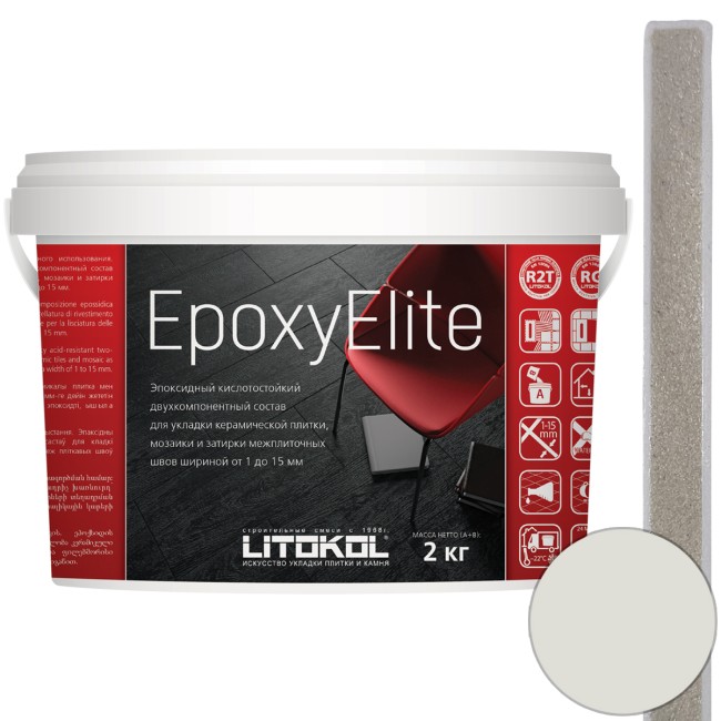 Затирка для плитки Litokol EpoxyElite – цветной двухкомпонентный эпоксидный состав, используемый для заполнения плиточных швов. Имеет превосходную адгезию к различным строительным поверхностям, стойкость к химическим и механическим нагрузкам. Применяется как заполнитель швов, но также может использоваться в качестве кислотостойкого клея для плитки. Как заполнитель швов предназначена для швов от 1 до 15 мм. Отлично подходит для керамической плитки, кислотоупорного клинкера, керамогранита, мозаики отдельных видов. Используется при внутренней и наружной отделке. Прекрасно зарекомендовала себя при облицовке стен и полов помещений, в том числе и влажных - кухонь, ванных и душевых, а также саун и хамамов, чаш бассейнов, и при наружной облицовке фасадов, цоколей, балконов. Применяется для полов с электрическим или водным подогревом. Имеет низкую эмиссию летучих органических соединений, поэтому безопасна при производстве облицовочных работ, и в дальнейшем при эксплуатации. Как затирочная смесь EpoxyElite соответствует классу RG (затирочный состав на основе реактивных смол для межплиточных швов). Как плиточный клей EpoxyElite соответствует классу R2T (клей на основе реактивных смол, улучшенного качества, с нулевым вертикальным сползанием).