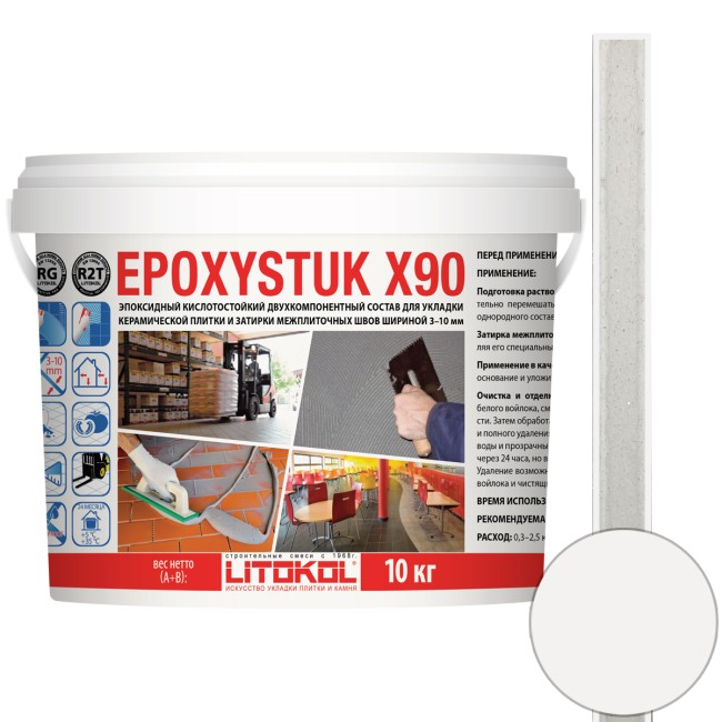 Затирка для плитки Litokol Epoxystuk X90 – цветной двухкомпонентный эпоксидный состав, используемый для заполнения плиточных швов. Имеет превосходную адгезию к различным строительным основаниям, стойкость к интенсивным химическим и механическим нагрузкам. Применяется как заполнитель швов, но также может использоваться в качестве кислотостойкого клея для плитки. Как заполнитель швов предназначена для швов от 3 до 10 мм. Отлично подходит для керамической плитки, кислотоупорного клинкера, керамогранита, мозаики - стеклянной и керамической. Используется при внутренней и наружной отделке. Прекрасно зарекомендовала себя при облицовке стен и полов не только в жилых помещениях, но и на предприятиях пищевой и животноводческой промышленности, в морозильных камерах, в общественных помещениях - залах в аэропортах и вокзалах, торговых центрах. Поскольку затирка отличается высокой устойчивостью к воздействию кислот и щелочей, она используется при облицовке поверхностей химических лабораторий, а также ёмкостей и резервуаров, предназначенных для хранения химически агрессивных жидкостей. Применяется для полов с электрическим или водным подогревом, а также для затирки плиточных и мозаичных поверхностей в чашах бассейнов, кухнях и душевых, саунах и хамамах. Незаменима при наружной облицовке цоколей, фасадов, балконов и террас. Имеет низкую эмиссию летучих органических соединений, поэтому безопасна при производстве облицовочных работ и в дальнейшем при эксплуатации. Как затирочная смесь Epoxystuk X90 соответствует классу RG (затирочный состав на основе реактивных смол для межплиточных швов). Как плиточный клей Epoxystuk X90 соответствует классу R2T (клей на основе реактивных смол, улучшенного качества, с нулевым вертикальным сползанием).