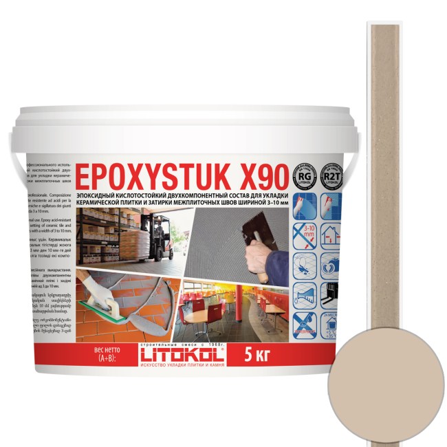 Затирка для плитки Litokol Epoxystuk X90 – цветной двухкомпонентный эпоксидный состав, используемый для заполнения плиточных швов. Имеет превосходную адгезию к различным строительным основаниям, стойкость к интенсивным химическим и механическим нагрузкам. Применяется как заполнитель швов, но также может использоваться в качестве кислотостойкого клея для плитки. Как заполнитель швов предназначена для швов от 3 до 10 мм. Отлично подходит для керамической плитки, кислотоупорного клинкера, керамогранита, мозаики - стеклянной и керамической. Используется при внутренней и наружной отделке. Прекрасно зарекомендовала себя при облицовке стен и полов не только в жилых помещениях, но и на предприятиях пищевой и животноводческой промышленности, в морозильных камерах, в общественных помещениях - залах в аэропортах и вокзалах, торговых центрах. Поскольку затирка отличается высокой устойчивостью к воздействию кислот и щелочей, она используется при облицовке поверхностей химических лабораторий, а также ёмкостей и резервуаров, предназначенных для хранения химически агрессивных жидкостей. Применяется для полов с электрическим или водным подогревом, а также для затирки плиточных и мозаичных поверхностей в чашах бассейнов, кухнях и душевых, саунах и хамамах. Незаменима при наружной облицовке цоколей, фасадов, балконов и террас. Имеет низкую эмиссию летучих органических соединений, поэтому безопасна при производстве облицовочных работ и в дальнейшем при эксплуатации. Как затирочная смесь Epoxystuk X90 соответствует классу RG (затирочный состав на основе реактивных смол для межплиточных швов). Как плиточный клей Epoxystuk X90 соответствует классу R2T (клей на основе реактивных смол, улучшенного качества, с нулевым вертикальным сползанием).