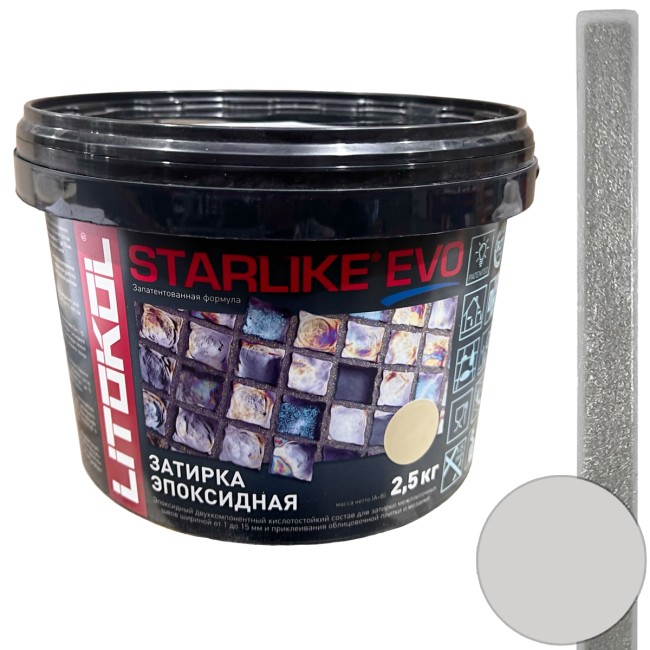 Затирка для плитки Litokol Starlike Evo – цветной двухкомпонентный эпоксидный состав, используемый для заполнения плиточных швов. Имеет превосходную адгезию к различным строительным поверхностям, стойкость к интенсивным химическим и механическим нагрузкам. Применяется как заполнитель швов, но также может использоваться в качестве кислотостойкого клея для плитки. Как заполнитель швов предназначена для швов от 1 до 15 мм. Отлично подходит для керамической, кислотоупорной плитки, клинкера, керамогранита, натурального и агломерированного камня, мозаики всех видов - стеклянной, каменной, керамической, металлической и деревянной. Используется при внутренней и наружной отделке на полах и стенах, в том числе подвергающимся значительным деформативным и вибрационным нагрузкам. Превосходно зарекомендовала себя при облицовке чаш бассейнов и полов с высокими механическими нагрузками (в торговых или общественных зданиях), поверхностей, подвергающихся постоянному воздействию химическими реагентами, щелочами или кислотами (химические лаборатории, предприятия пищевой промышленности). Имеет низкую эмиссию летучих органических соединений, поэтому безопасна при производстве облицовочных работ, и в дальнейшем при эксплуатации. Как затирочная смесь Starlike Evo соответствует классу RG (затирочныи состав на основе реактивных смол для межплиточных швов). Как плиточный клей Starlike Evo соответствует классу R2T (клеи на основе реактивных смол, улучшенного качества, с нулевым вертикальным сползанием).