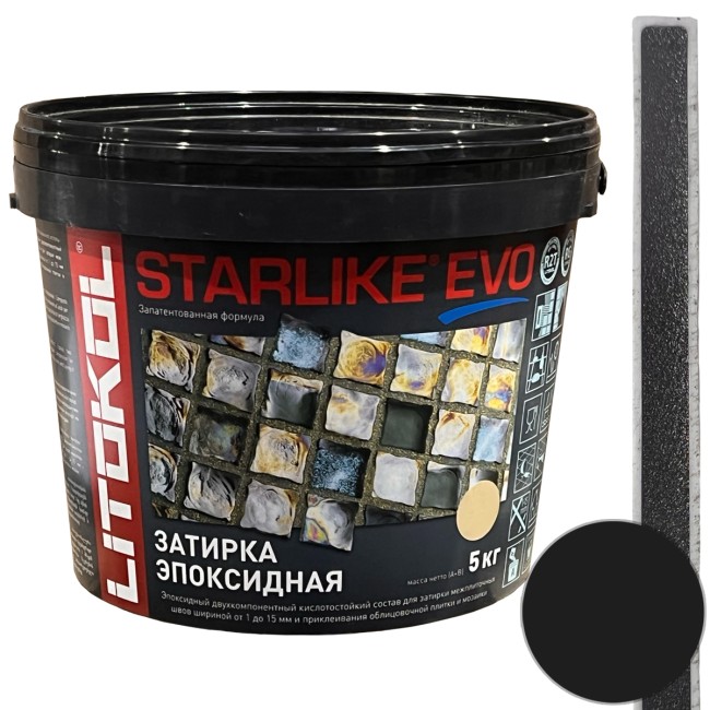 Затирка для плитки Litokol Starlike Evo – цветной двухкомпонентный эпоксидный состав, используемый для заполнения плиточных швов. Имеет превосходную адгезию к различным строительным поверхностям, стойкость к интенсивным химическим и механическим нагрузкам. Применяется как заполнитель швов, но также может использоваться в качестве кислотостойкого клея для плитки. Как заполнитель швов предназначена для швов от 1 до 15 мм. Отлично подходит для керамической, кислотоупорной плитки, клинкера, керамогранита, натурального и агломерированного камня, мозаики всех видов - стеклянной, каменной, керамической, металлической и деревянной. Используется при внутренней и наружной отделке на полах и стенах, в том числе подвергающимся значительным деформативным и вибрационным нагрузкам. Превосходно зарекомендовала себя при облицовке чаш бассейнов и полов с высокими механическими нагрузками (в торговых или общественных зданиях), поверхностей, подвергающихся постоянному воздействию химическими реагентами, щелочами или кислотами (химические лаборатории, предприятия пищевой промышленности). Имеет низкую эмиссию летучих органических соединений, поэтому безопасна при производстве облицовочных работ, и в дальнейшем при эксплуатации. Как затирочная смесь Starlike Evo соответствует классу RG (затирочныи состав на основе реактивных смол для межплиточных швов). Как плиточный клей Starlike Evo соответствует классу R2T (клеи на основе реактивных смол, улучшенного качества, с нулевым вертикальным сползанием).