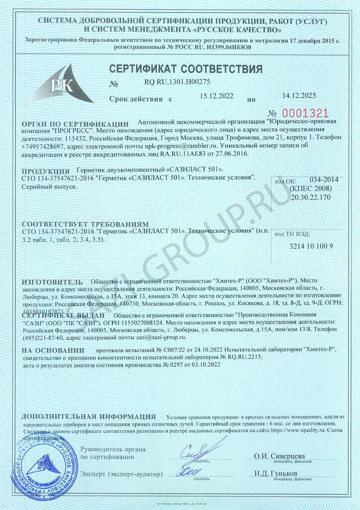 Сазиласт 501 – это двухкомпонентный полисульфидный заливочный герметик для герметизации деформационных швов и нагруженных бетонных конструкций с деформацией до 25%, устойчивый к маслам, топливу, влаге и дорожным нагрузкам. Оптимален для профессионального применения на дорогах, мостах и бетонных покрытиях, где требуется долговечная защита и высокая адгезия к минеральным основаниям и металлу.